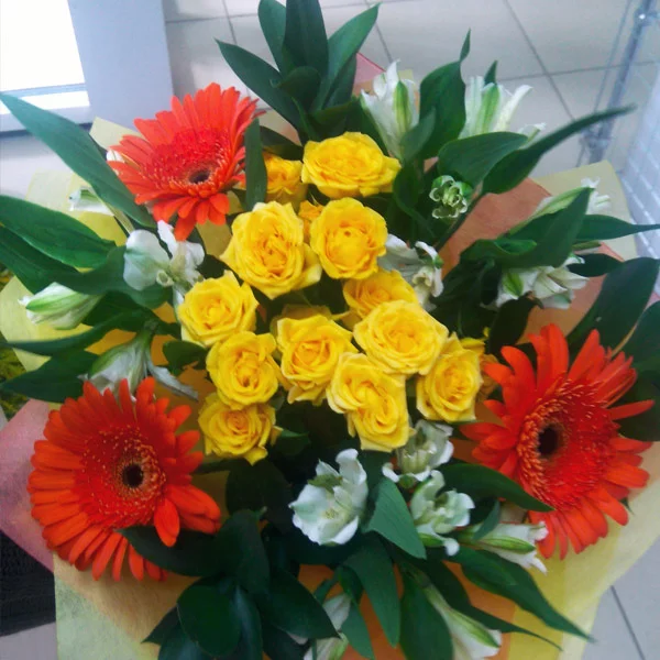 Смешанный выразительный букет из огненно-оранжевых гербер, желтых роз и нежных белых альстромерий великолепно дополнен рускусом. Яркий букет будет отличным дополнением к подарку в день рождения любимой мамы или сестры, а также выражением благодарности дорогой подруге или коллеге